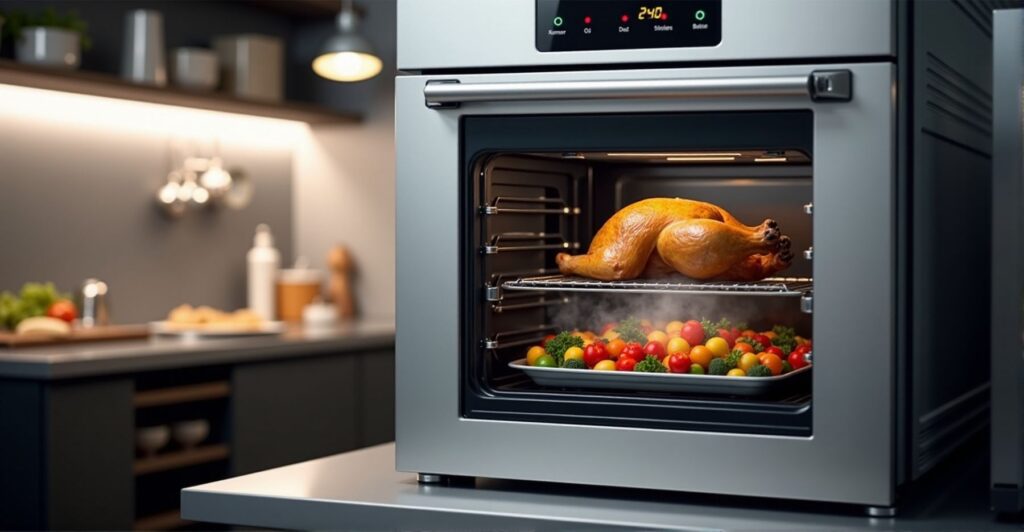 Het grote verschil tussen normale ovens (oftewel heteluchtovens) en stoomovens is dat normale ovens gebruikmaken van lucht om je eten te verhitten, terwijl stoomovens je eten verwarmen met waterdamp.